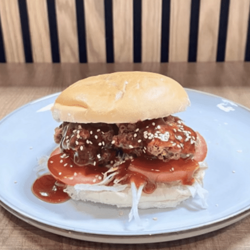Lekkere burger gevuld met halal Seoul Korean fried chicken stukjes, sla, komkommer en zoetzure saus